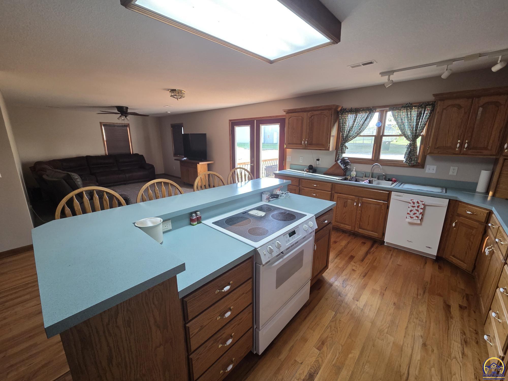 This charming home is well maintained and thoughtfully updated over the years offering a blend of charm, space and modern convenience. There is room for everyone with 4 bedrooms and 2 baths. A separate room with a built in desktop is perfect for work at home employees or would also make a great craft room. Much to love about the improvements made over recent years. In 2013 a durable metal roof was installed providing peace of mind for years to come. A 2000 remodel included the entire main floor with new plumbing, electrical, sheetrock and a spacious south side expansion featuring a bright kitchen and comfortable living room. In 2023 a brand new heating and central air condition system was added for efficient year-round comfort. The home was relocated from West of Holton onto a new poured concrete crawlspace foundation at this current address in 2025. Along with that the sheetrock was repaired, freshly painted and new carpet was installed in the living room, office, hallway and all three main floor bedrooms. A new treated front porch was also added to complement the existing composite deck perfect for enjoying quiet evenings and outdoor BBQ's. With modern systems, a solid foundation and fresh finishes throughout, this home is move in ready and prepared to serve its next owners well.