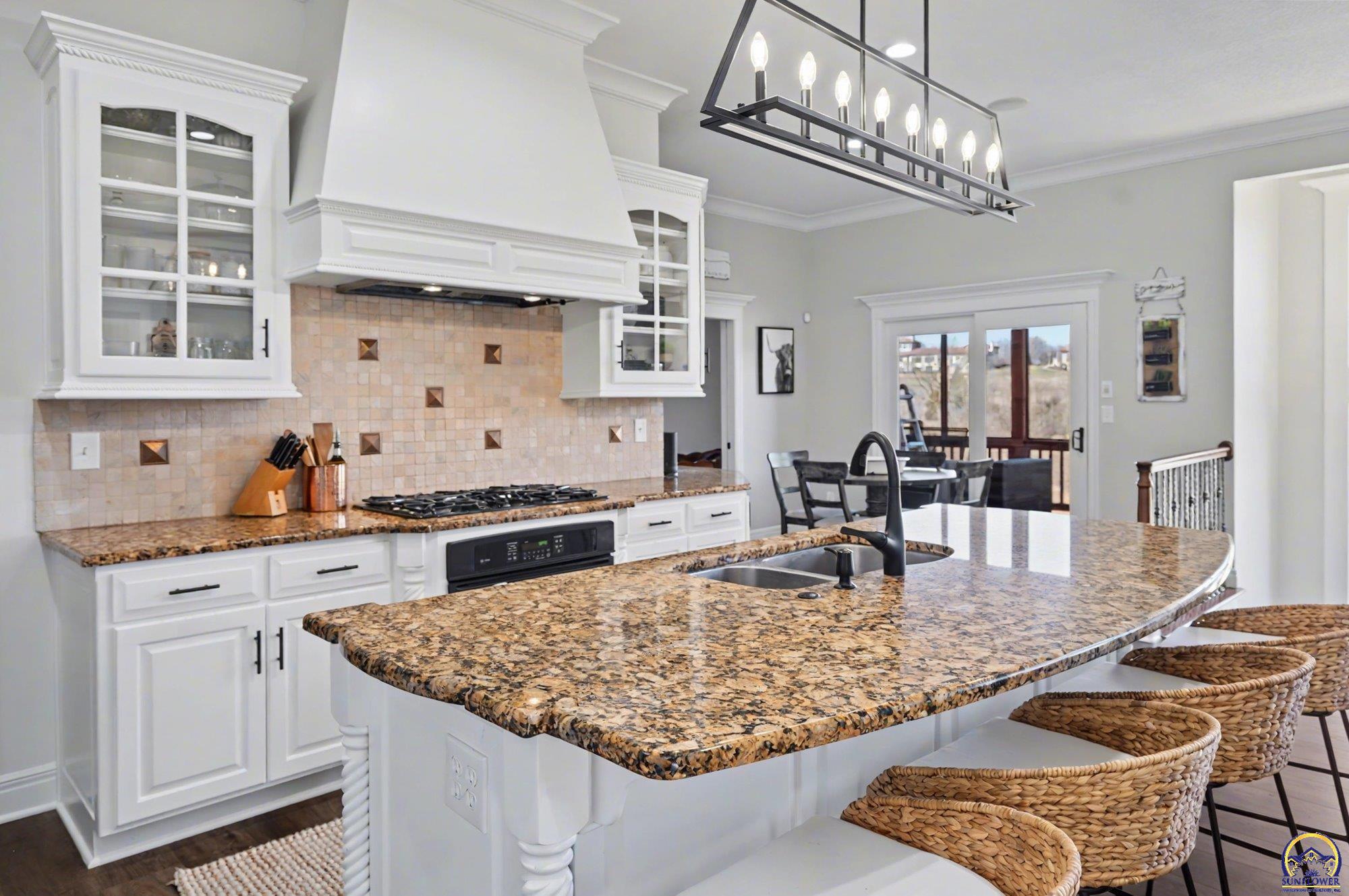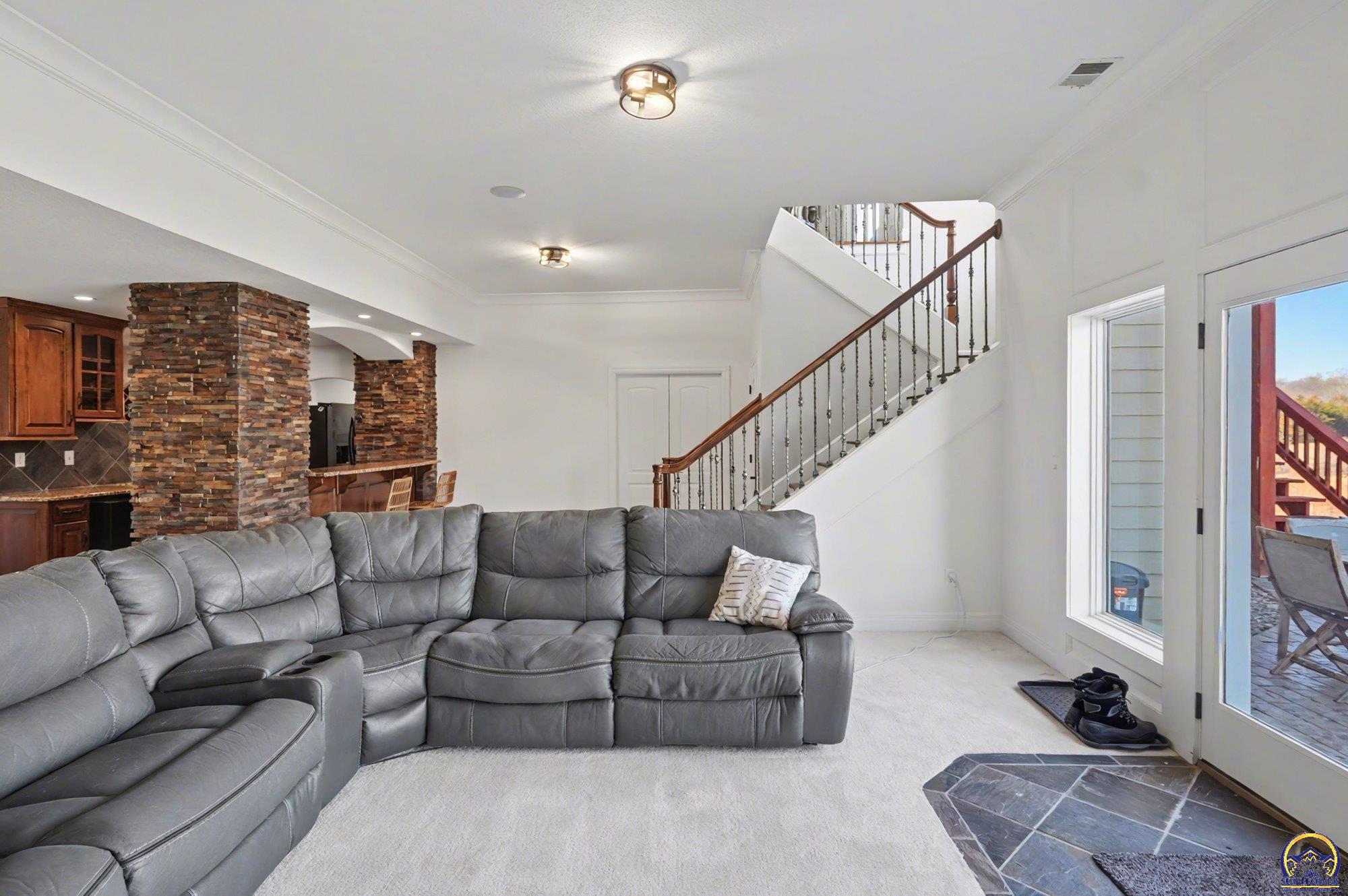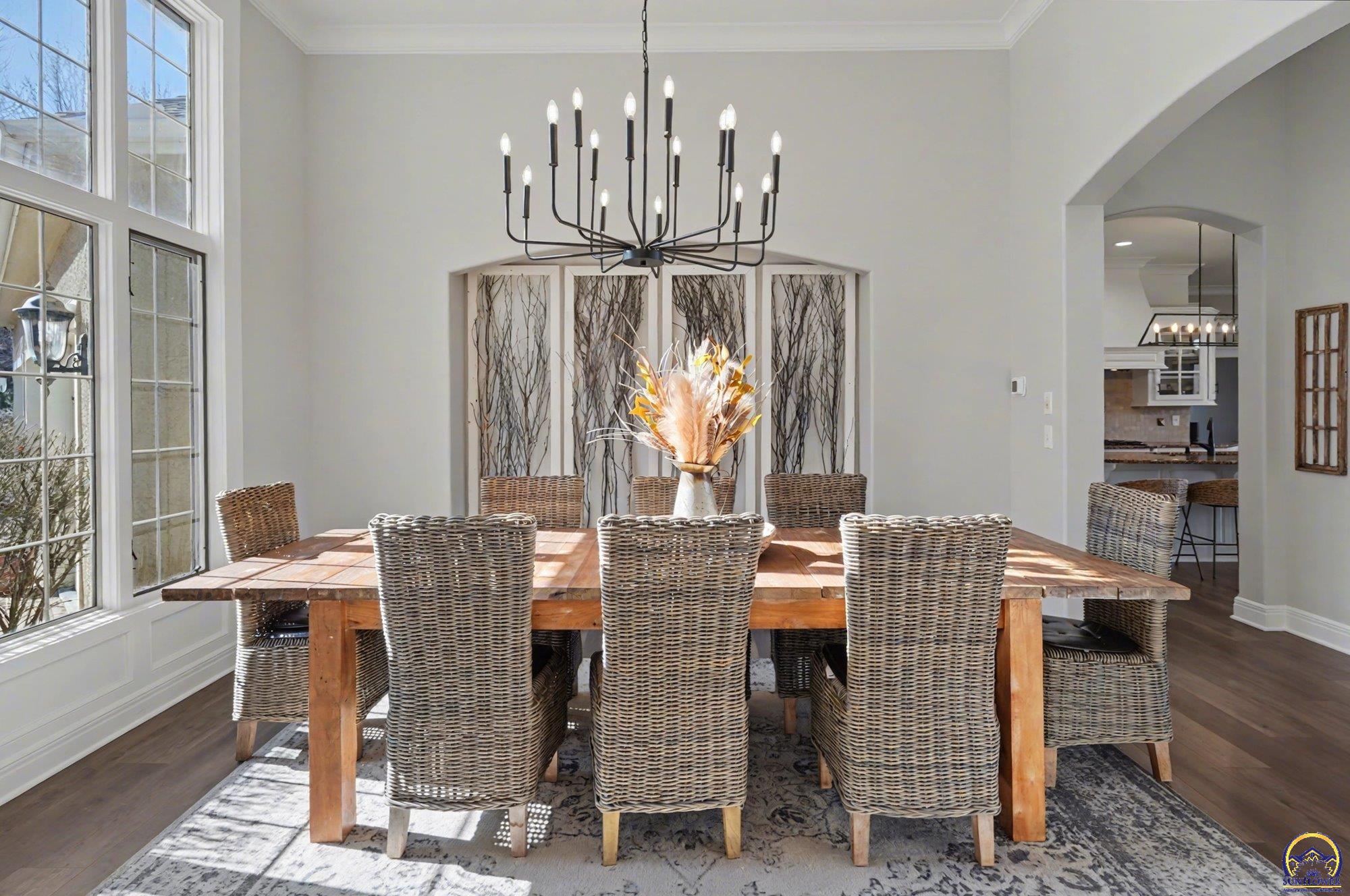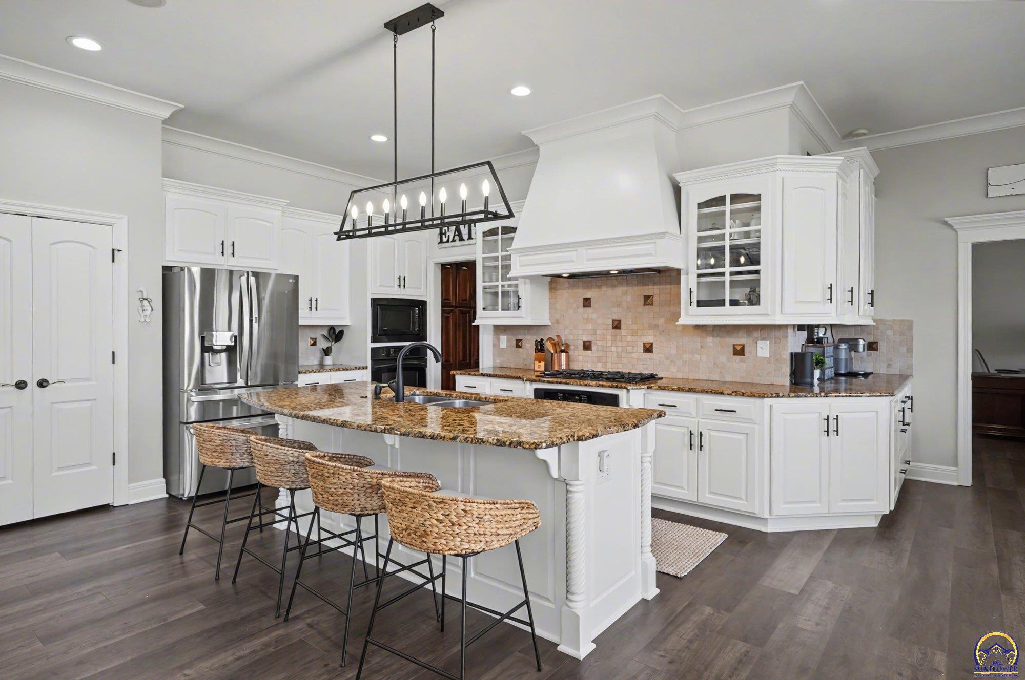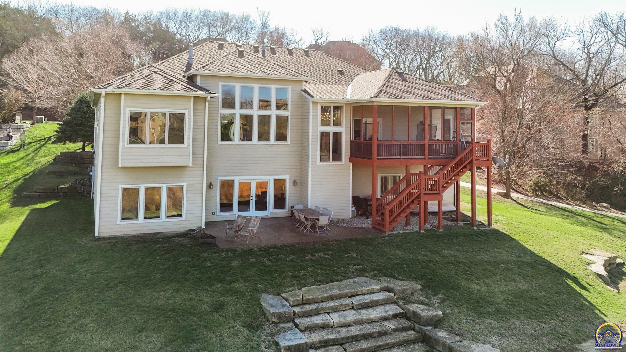Unique opportunity to own an expertly crafted luxury home located in a quiet neighborhood. Soaring ceilings, high end finishes, 1,380 sq ft of unfinished storage with natural light and windows everywhere. Major expense updating trim & cabinet paint, double HVACs, flooring, lighting, etc. Kitchen has double wall ovens, gas cooktop, a large kitchen island next to a screened in deck overlooking all of the land going down to the lake that the neighbor owns. Formal dining room offers a refined space for entertaining or hosting special holiday gatherings. Guest room on the front and office/3rd bedroom on the back. The full walkout basement has even more living space with 2 additional bedrooms and a large second living area. A wet bar complete with a pantry, refrigerator, dishwasher, and microwave perfect for hosting guests or watching movies. Enjoy colorful Kansas sunsets in your back yard with no HOA to answer to.