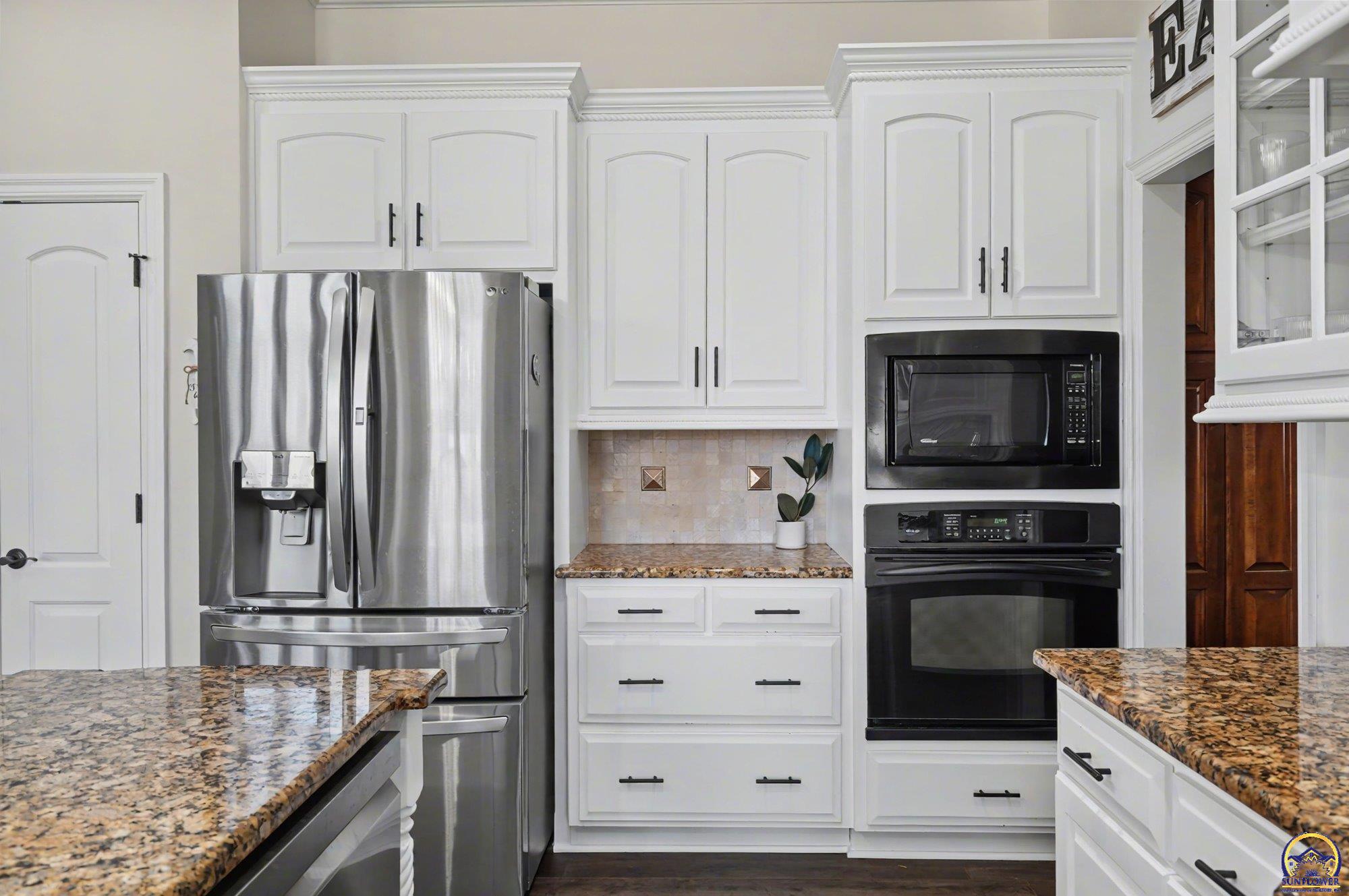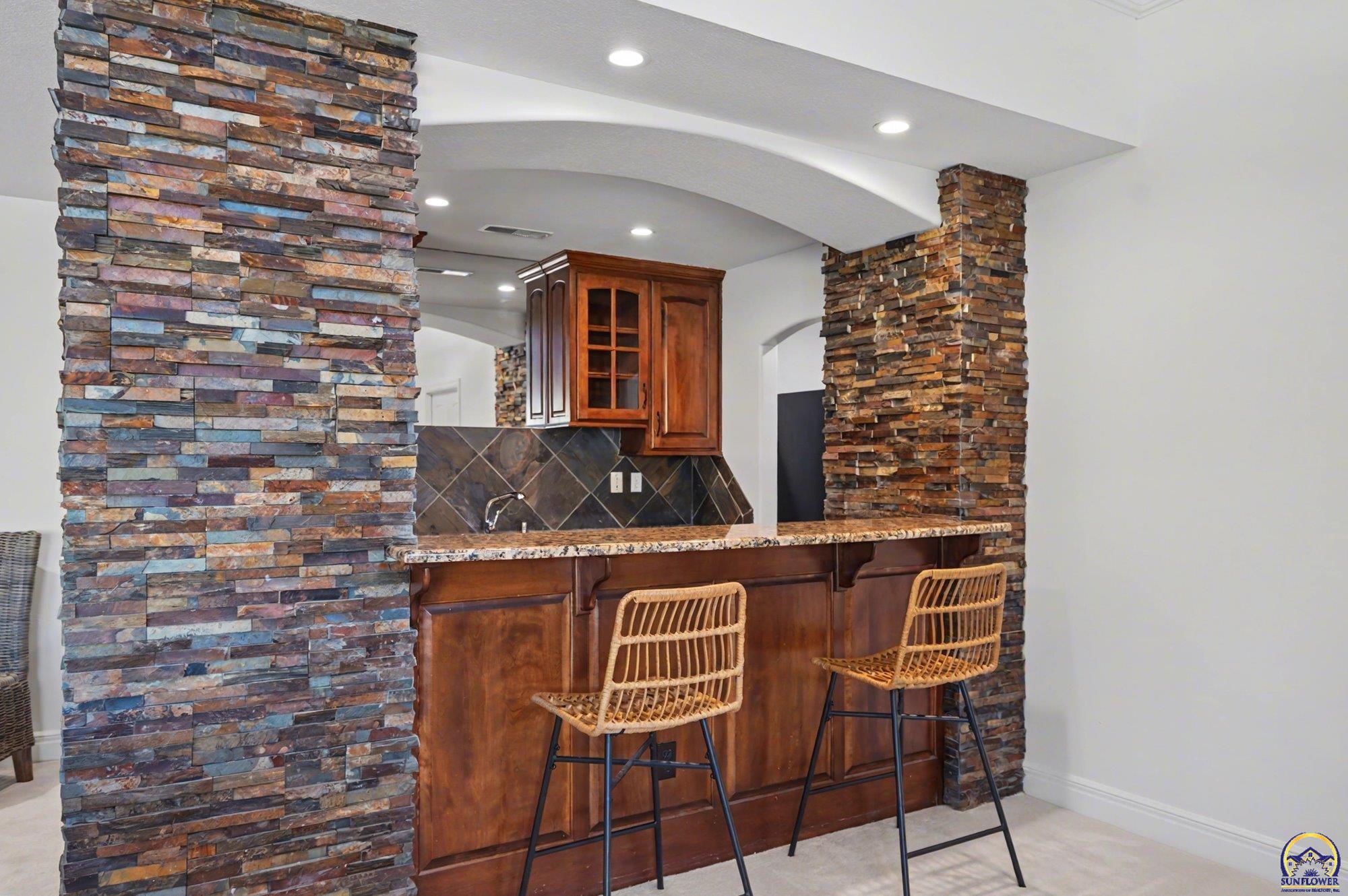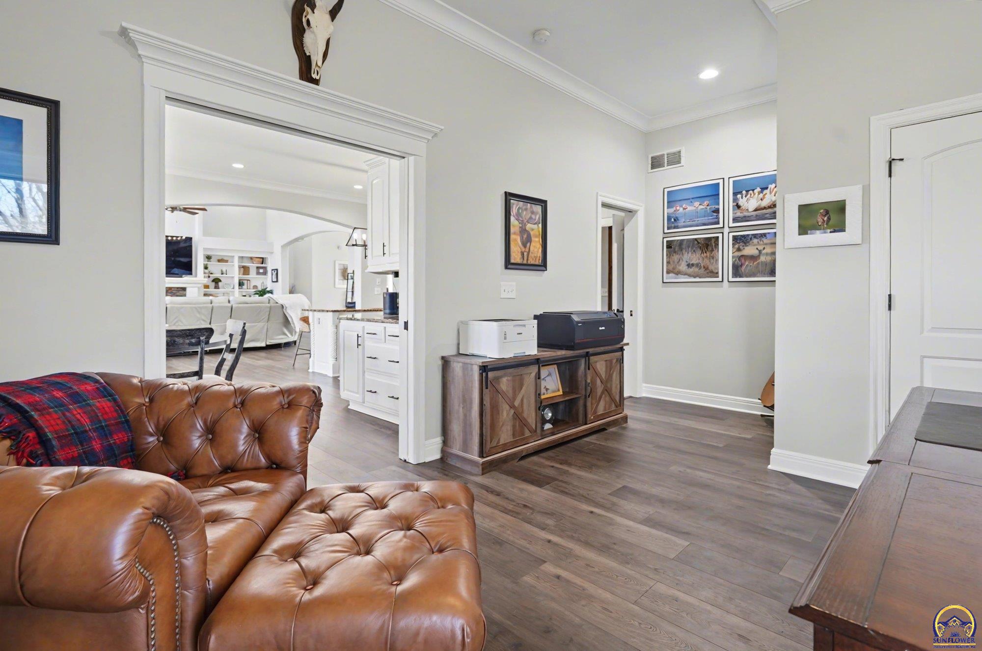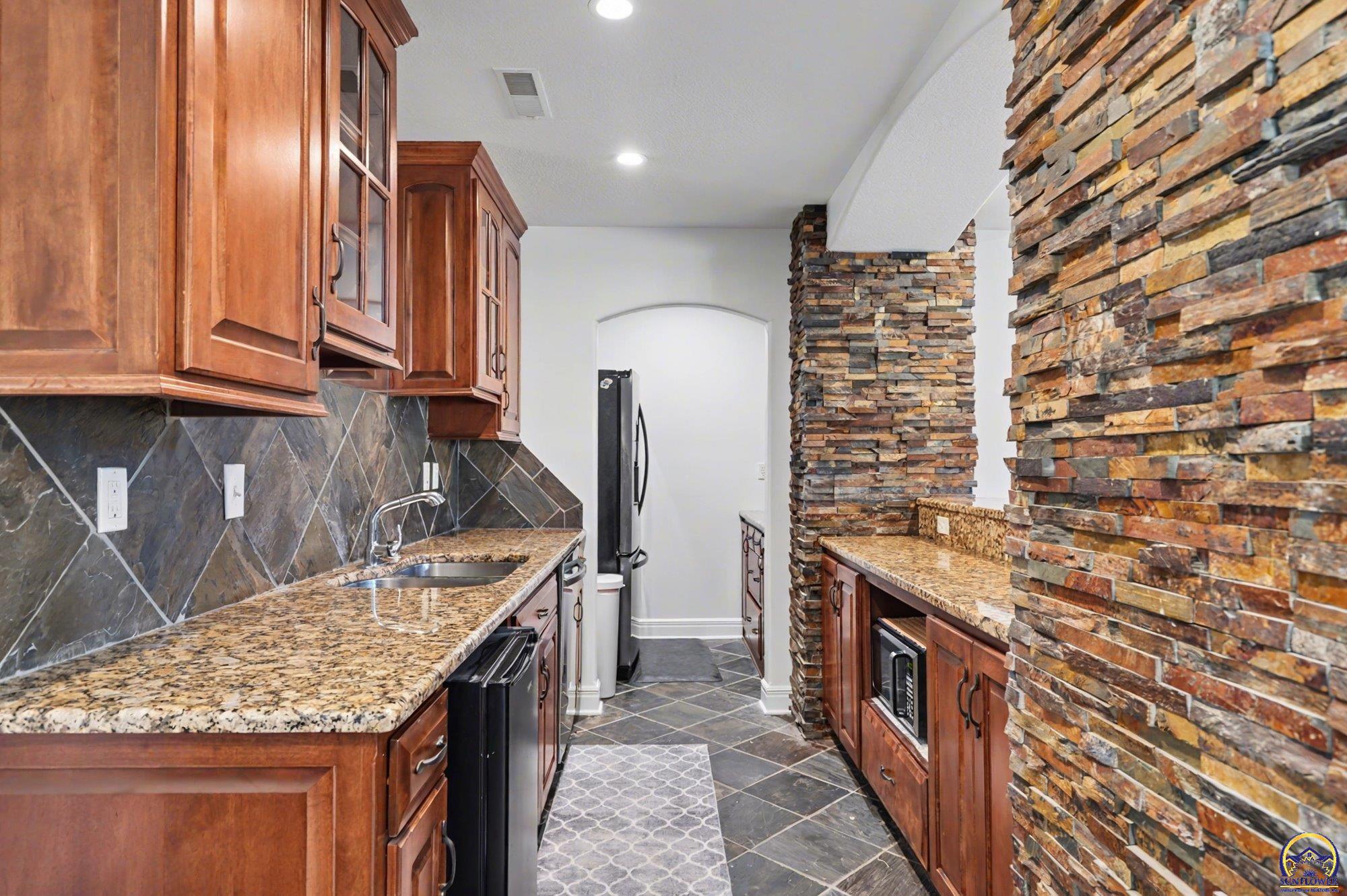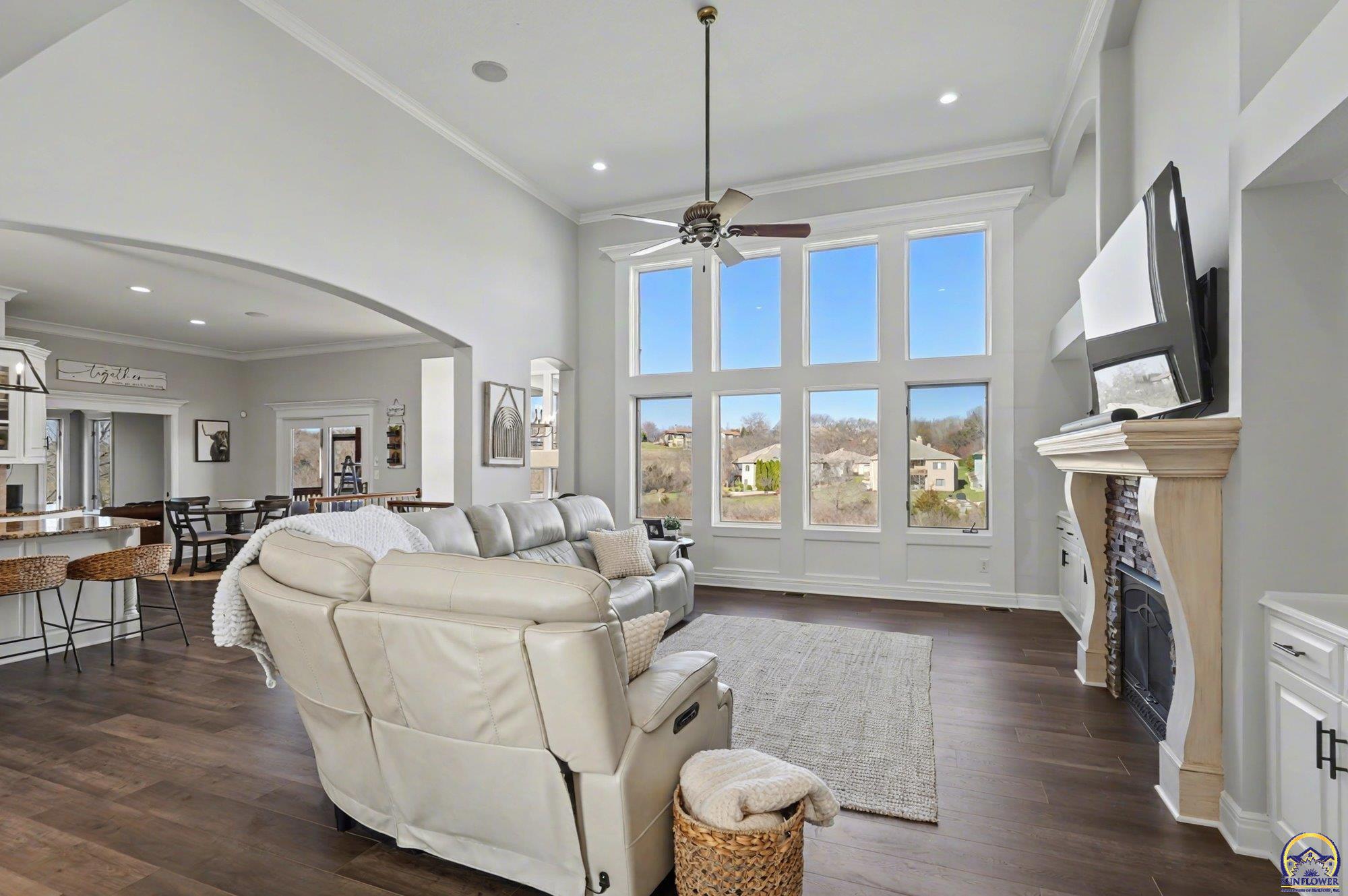Unique opportunity to own an expertly crafted luxury home located in a quiet neighborhood. Soaring ceilings, high end finishes, 1,380 sq ft of unfinished storage with natural light and windows everywhere. Major expense updating trim & cabinet paint, double HVACs, flooring, lighting, etc. Kitchen has double wall ovens, gas cooktop, a large kitchen island next to a screened in deck overlooking all of the land going down to the lake that the neighbor owns. Formal dining room offers a refined space for entertaining or hosting special holiday gatherings. Guest room on the front and office/3rd bedroom on the back. The full walkout basement has even more living space with 2 additional bedrooms and a large second living area. A wet bar complete with a pantry, refrigerator, dishwasher, and microwave perfect for hosting guests or watching movies. Enjoy colorful Kansas sunsets in your back yard with no HOA to answer to.